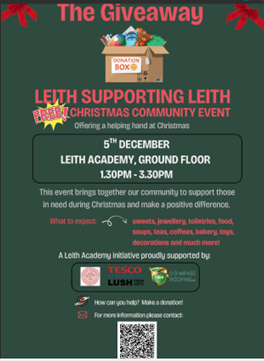 Leith Helping Leith Give Away – We are preparing this year’s event to help our Families of the Leith Community. We will gladly receive donations after the October break. We are looking for: toys and children’s clothes in good condition, unwanted gifts, toiletries, jewellery etc. If they have any questions, use the QR code on the poster.